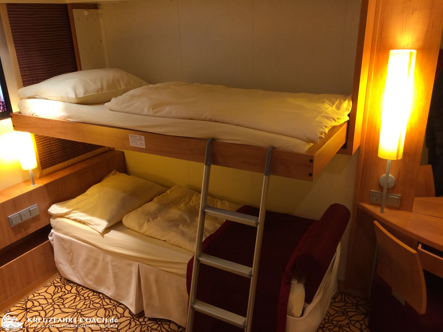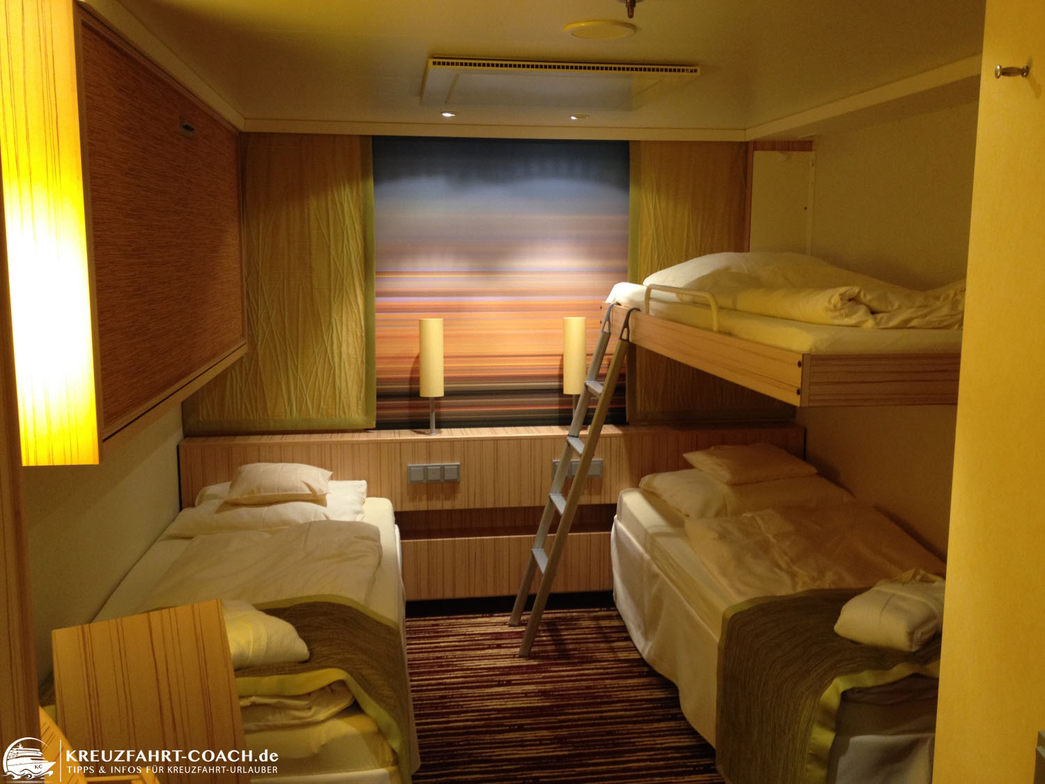 Wir hatten z. B. mal eine 4-Bett-Innenkabine mit Pullman-Betten. Wie man auf dem Bild unten sehen kann, stehen die unteren Betten getrennt. Rechts ist das Pullman-Bett ausgeklappt und kann über die Leiter betreten werden. Links sieht man das eingeklappte Bett. Das wäre also die Variante für eine Belegung mit 3 Personen: