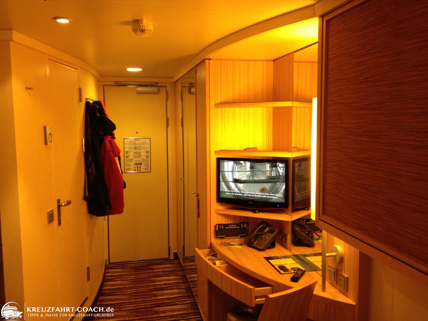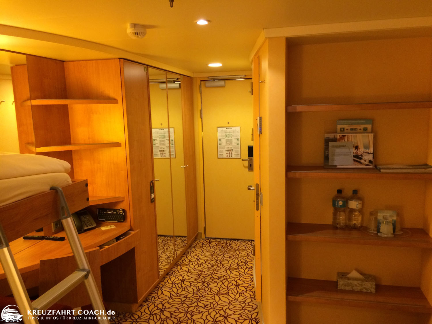 Koffer lassen sich übrigens gut unter den unteren Betten verstauen. Auf dem Bild oben (AIDAmar) ist auch zu sehen, dass man den Fernseher im Rücken hat. Ein bisschen unpraktisch – aber man ist ja auch nicht zum Fernsehen auf dem Schiff. Wenn man im Bord-TV eine der Außenkameras wählt, dann hat man durch den großen Bildschirm auch schon fast sowas wie eine virtuelle „Meerblick-Kabine“. Auf der AIDAsol ist der Fernseher zwar kleiner und im Regal eingebaut (Bilder siehe unten). Dafür kann man direkt aus dem Bett drauf blicken.