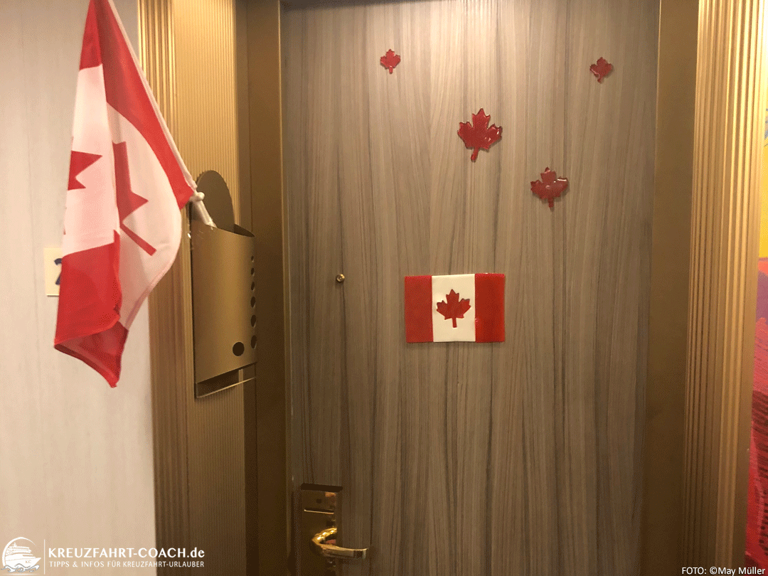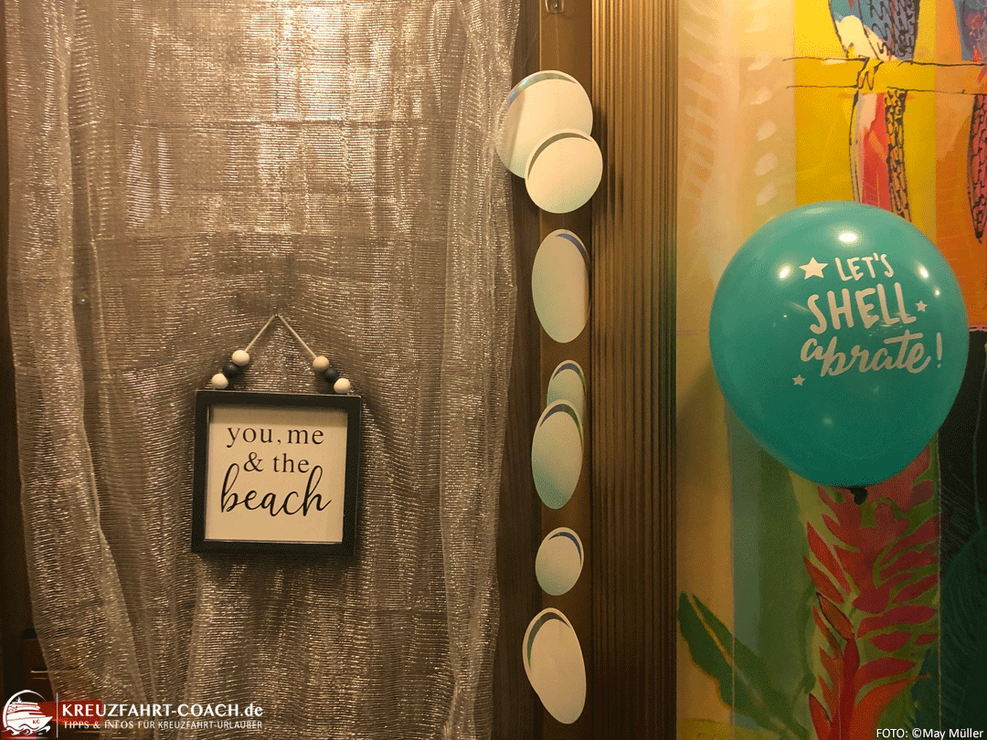 Ebenfalls beliebt ist das Dekorieren der Kabinentür mit dem Gruppennamen oder dem Anlass der Reise (siehe Fotos).